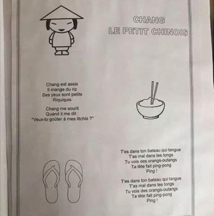 据法国《20分钟报》2017年12月30日报道,这一歌曲名为《张,我的矮个中国人》,歌词中充满侮辱华人的内容,包括“张坐着吃米饭,他的眼睛真小,小得好可怜”“坐在摇晃的小船中,脑袋晃荡如乒乓球砰砰响”。《费加罗报》称,巴黎郊区欧贝赫维利耶市一家幼儿园教授孩子们吟唱该歌曲超过10年,一些震惊的亚裔家长近日将它上传到社交网上才引发舆论关注。