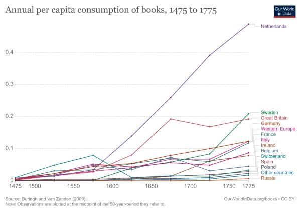 15世纪欧洲书籍消费很低。1575年後,荷兰书籍消费量突增,这正是欧洲人到达亚洲,通过 “倭寇” 接触中国之后。美国立国前,荷兰的个人书籍消费遥遥领先(每人0.49本),是荷兰殖民时代引起的高峰。书籍消费量第二的英国(每人0.19本),不及荷兰一半(图 2)。