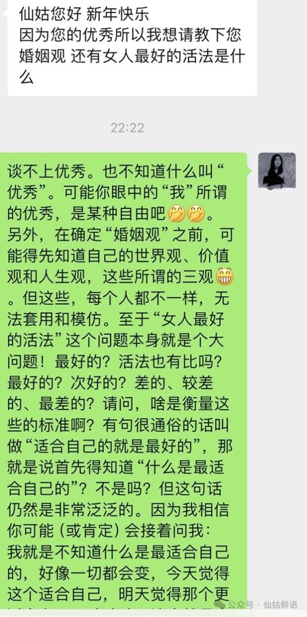 就在昨天夜里,我刚准备喝点安神茶去睡觉了,突然收到一条微信信息。对方的微信头像是一个红唇,没有名字。她发来的信息,是一个问题。她写道:“仙姑您好,新年快乐!因为您的优秀所以我想请教下您婚姻观,还有女人最好的活法是什么?”