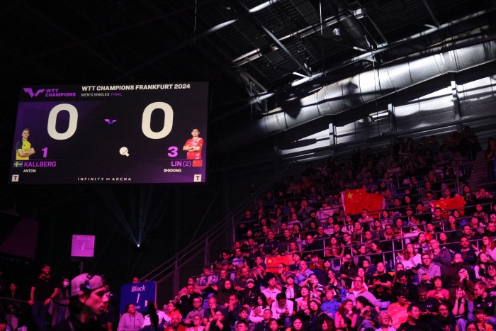 中国19岁小将林诗栋,在中国一号种子选手王楚钦八分之一决赛被淘汰之际,顶住压力,一路杀进决赛。在决赛中以4:1 战胜瑞典选手卡尔伯格,为自己职业生涯赢得了宝贵的一份大礼:30000美元奖金和1000积分。如瑞典名将瓦尔德内尔曾经评价:“林诗栋的反手拉技术可谓如此顶尖,令人振奋,展现出强烈的男性气概和精神状态”、“林诗栋势必能超过王楚钦”。此战之后,林诗栋将以6620积分、男单世界第二的地位,逼近并有望近期超越王楚钦,成为男单世界第一指日可待。在WTT法兰克福冠军赛决战之日,赛场上座无虚席。来自欧洲各地的华侨华人,为中国运动员加油助威。法兰克福苏瓦格体育馆内各个方向的坐台上,都能看到中国观众手举五星红旗,分外耀眼。