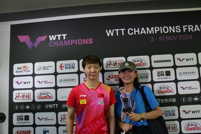 (《法国和世界新闻网》驻德国记者周杰、 合惠报道) 2024年11月10日,在欧洲著名的空中交通枢纽和世金融中心法兰克福,中国乒乓球队迎来新的胜利。中国林诗栋、王曼昱分别战胜瑞典男单选手安东·卡尔伯格、中国女单选手王艺迪,包揽世界乒联法兰克福冠军赛男女单打冠军。一位幸运的女球迷,拿到偶像王曼昱签名,激动地与偶像合影。