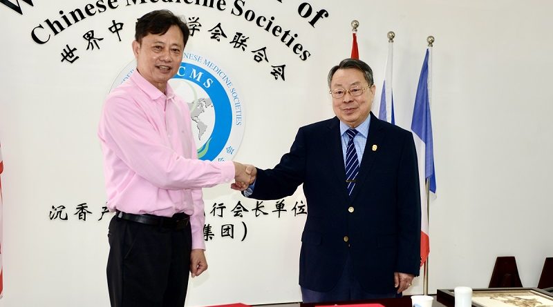 茂名市电白区沉香协会会长汪科元和世界华文大众传播媒体协会主席吴治欧签署电子商城合作协议。