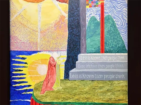 好在有第十一厅的“霍克尼” : « 人们所知远不及其所想 » – 这个略显不同于以往的霍克尼。主要由两幅作品组成,一个是题为“致蒙克” (After Munch),另一个是“致布莱克”(After Blake)。第一幅画面中有一位智者或哲人模样的老者站在树下,正在向一名儿童传授知识;右侧有三位托着地球仪的优雅女子,分别代表天文、历史和地理,左侧写着“过去”,右侧写着“未来”。据说这幅画的标题取自1999年的《纽约时报》中一篇关于科学之“不可知”本质的文章,霍克尼当时将其剪下来一直贴在画室的墙上,并将“人们所知远不及其所想”写在作品的下方(2023年),而作品的原型源自蒙克的一张小稿素描。另一幅完成于2024年的“致布莱克”,则取自威廉·布莱克为《神曲》绘制的插图。霍克尼近乎神经质般地在画面中重复了三次这句“人们所知远不及其所想”,并描绘在中世纪诗人但丁与古罗马诗人维吉尔共同步入地狱的阶梯上(也或许是通向天堂的路径)。而布莱克原作水彩画中那位引导的天使则在霍克尼的画里消失了;取而代之的是作品中间下方的红色帷幕开口中的:“当下即永恒”。