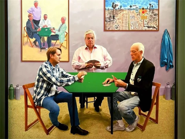 对霍克尼来说,法国给予他的,也许不是“古典”的教条,而是一种简约、真实,进而指向“现代性”的感知。绘画中的真理吗?或许不是哲学家德里达引用塞尚的那句“真理在绘画中”,而是一次次的面对现实的“对话”。比如他后来在诺曼底画的苹果树们 – 它们以最直接、诚实、不加修饰的“语言”与他交流,远离法语那繁复华丽的修辞。霍克尼最喜欢重复的一句话就是:“我生活在当下,我画的是当下。” 霍克尼从毕加索那里借鉴了“立体主义” 的多视角表现手法;从马蒂斯那里,他学到了通过色彩来突出物体的重要性。他定居诺曼底后的家具摆设中甚至都带有梵高作品的影子,梵高和塞尚也是两位深深影响了霍克尼的法国艺术家:霍克尼向梵高致敬,画了《文森特的椅子与烟斗》,他从塞尚的《纸牌玩家》主题中汲取灵感,但霍克尼并不满足于呈现两位玩家的画面,他选择了其中一个版本,描绘了三名玩家和站着观察的男人。这不仅仅是个点缀,而是对这段历史的深刻反思和引用。2019年3月,霍克尼开始在速写本上描绘周围环境,到了夏末,他又开始绘制花园中的树木:一棵苹果树、一棵梨树和一棵榅桲树。他坚持将这三棵树一同呈现在2025年春季的展览中,让它们作为自然界生活的见证,见证时间的流逝,也见证他在诺曼底度过的这些岁月。他在画面上空那种由并置笔触构成的独特天空震颤中,悄然流露出霍克尼与梵高作品之间的亲密感,传达出那些简单而幸福时光的恒久感,就像《农事与时光》中所述的一样。这段逗留对霍克尼而言,比往常更久更持续,使这一系列作品在他艺术生涯中显得尤为独特和耐人寻味。自2020年3月至2021年5月的疫情与封锁期间,更是激发出他昼夜不停的创作热情。此次展览完整呈现了这些iPad作品,由霍克尼与其助手乔纳森·威尔金森( Jonathan Wilkinson)经过数月精心挑选。作品以大小不一的格式被印刷和装裱,然后铺满整个墙面,形成复杂的网格与结构,还穿插有动态的画面,使iPad重新呈现为屏幕本身。正如一部没有起点也没有终点的电影,这些自然状态按艺术家设定的次序呈现出来,他本身也早已超越了时间的束缚。
