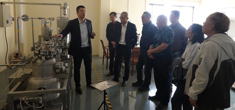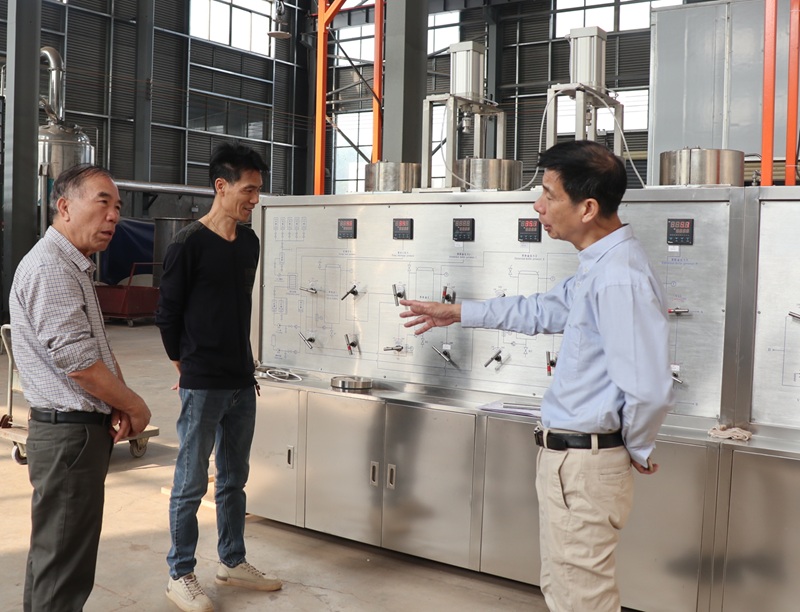 小冈香业联合会副会长戴剑豪介绍精油萃取设备。