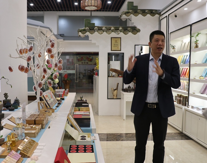 大成制香总经理办公室负责人顿杰向记者介绍产品。